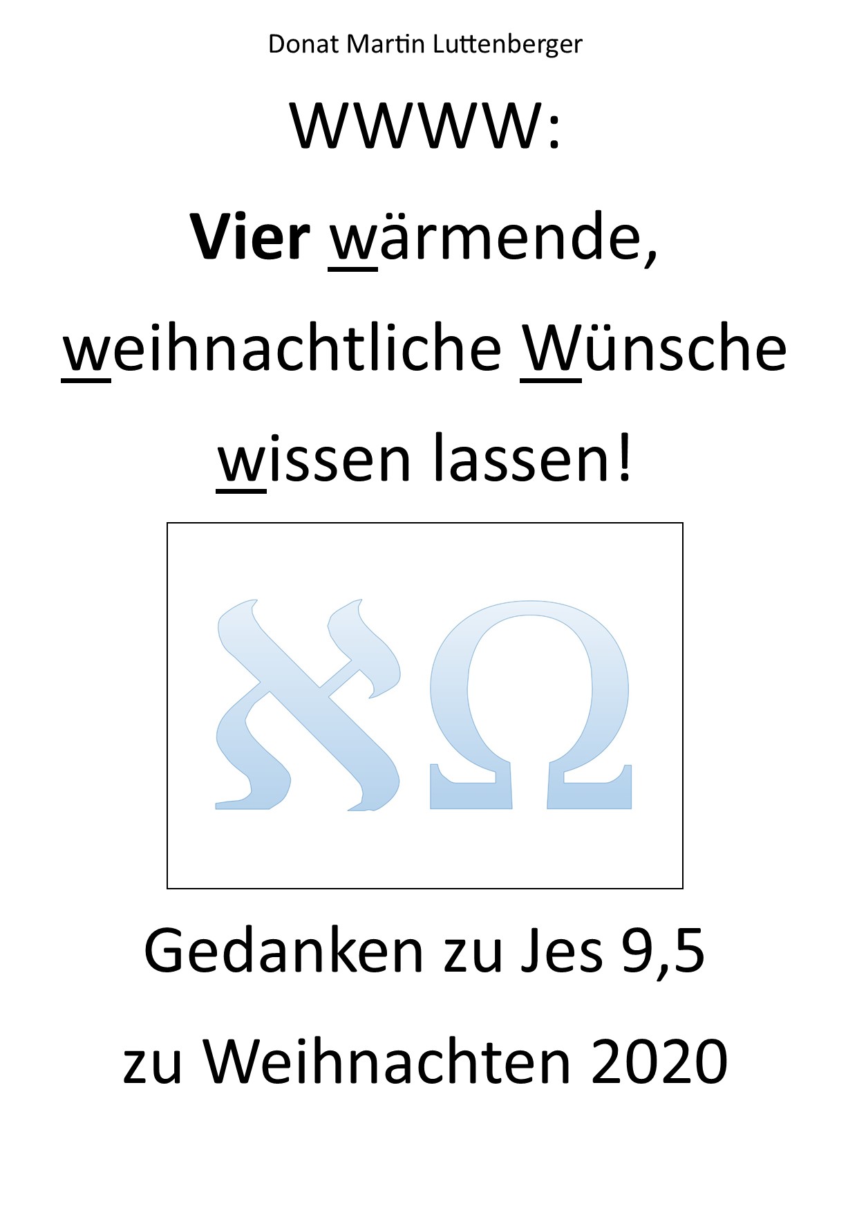 Sie erhalten mit dieser pdf-Datei kostenfrei zu einer kleinen Predigttextvers-Synopse eine Predigt(abhandlung) zu Jes 9,5 (obgleich aus dem Predigttext I der Reihe I) zum 4. Advent und zu Weihnachten 2020 zum gesegneten Gebrauch und gern auch, wenn gewollt, zur geschenkweisen Weitergabe.